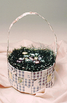 Glue the first 27" strip to the inside of the handle, then bring it in front of the first 8" strip; behind the next; in front of the next and so on until you get to the next handle strip. (Pull the strip a little to tighten up the basket and make sure it is meeting the base of the basket). Glue it to the inside of the handle and continue weaving starting with outside the next strip and so on until you get all the way around the basket to the starting point. (Again, pull the strip to tighten making sure it meets the base).Glue the strip to the starting point and trim away any excess.