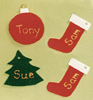 Cut assorted Holiday shapes out of colored felt and hot glue (or tacky glue) together. (For the ornament tag, the rectangle extends down behind the circle to hold). Let dry/cool. Use a hole punch to create a hole for hanging. (For the ornament tag, glue a length of folded metallic cord behind for hanging.) Write names with glitter glue pens or glue and glitter and allow to dry. Attach to gift with small length of coordinating ribbon.
