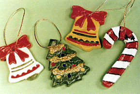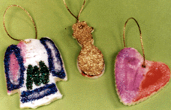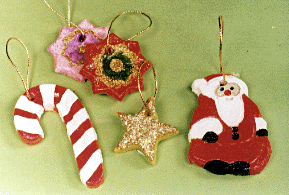 Remove from baking dish, and let ornaments set for 24hrs. to finish drying. Decorate with watercolors, tempera paints, acrylics, or markers. Write or paint on back of ornament name, date or some other small inscription. Let dry. Coat with 1-2 layers of spray varnish or other clear protective coating. Let dry.